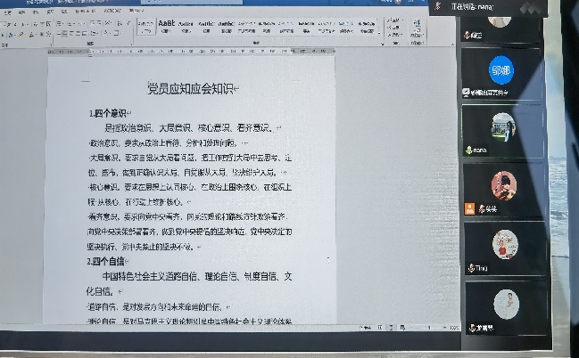 宣传委员邬娜带领大家开展政治理论学习。首先对四个意识、四个全面、两个维护、“政治三力”等基础理论、理念开展巩固学习。其次,针对《中国共产党普通高等学校基层组织工作条例》开展学习,进一步明确党对普通高等学校的全面领导地位。最后,深入学习《“十四五”现代综合交通运输体系发展规划》,为新一轮“双一流”建设贡献智慧和力量。