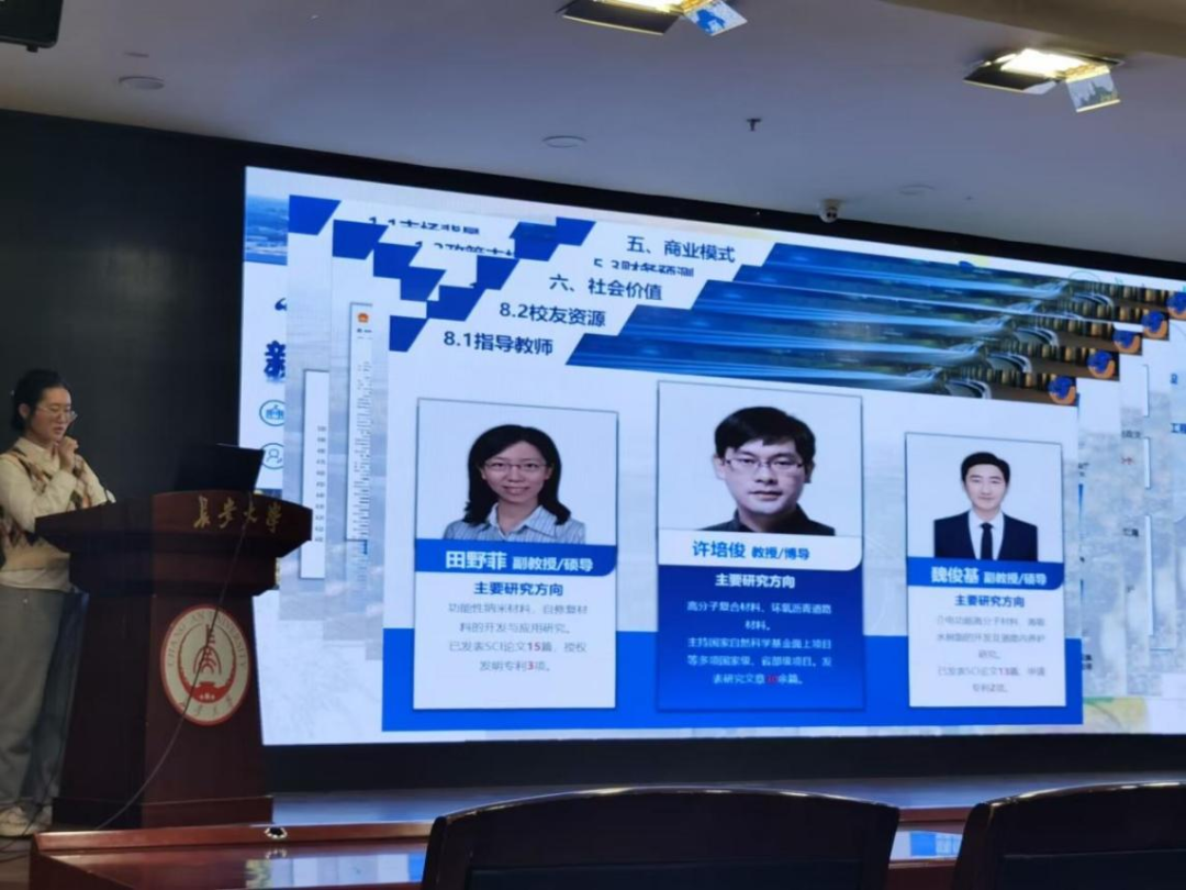电控学院郭迪同学介绍了比赛历程,接着强调了项目需要紧扣政策背景与行业痛点,若有创新性佐证材料和知识产权将大有帮助。