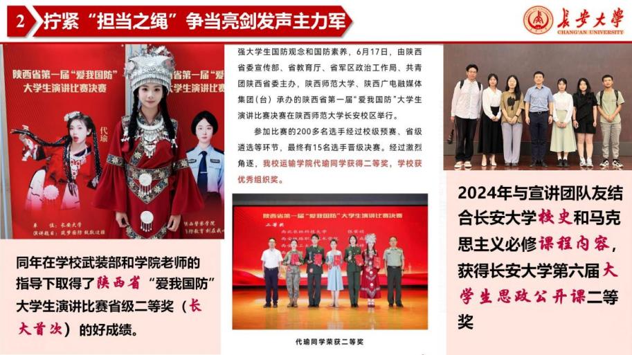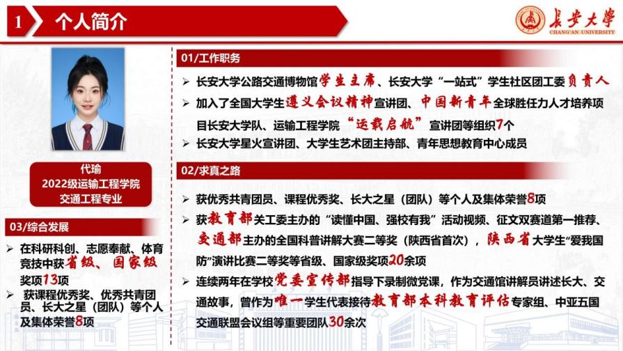 代瑜,女,汉族,工口漫画 2022级交通工程专业学生。连续两年综合测评附加分专业第一,累计担任工口漫画 公路交通博物馆志愿者服务协会主席、共青团工口漫画 学生社区负责人、工口漫画 运途启航宣讲团团长、全国大学生遵义会议精神宣讲团成员等职务13项。获优秀共青团员、课程优秀奖、长大之星(团队)等个人及集体荣誉8项。两年来获交通运输部全国交通运输科普讲解大赛三等奖(陕西省首次)、国家级大学生创新创业训练计划、全国大学生交通运输科技大赛陕西省一等奖等各类竞赛国家级、省级、校级奖项40余项。