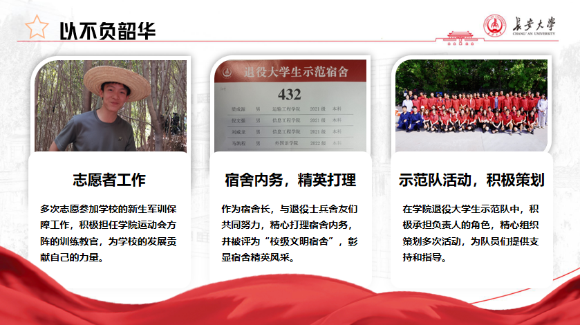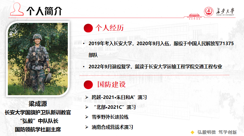 梁成源,男,壮族,工口漫画 交通工程专业2021级本科生。2020年参军入伍,服役于中国人民解放军71375部队。在部队担任工程兵爆破手、装甲车车长、新闻报道员等身份,五次参与爆破作业,并负责连队生活及训练的记录报道工作,因表现良好,被选派往集团军军官集训队新闻报道小组,在战区宣传平台上参与写作发表三篇新闻报道。两年坚守在祖国北疆,保家卫国,坚守使命。服役期间梁成源参加“跨越-2021·朱日和A”演习、“北部·2021C”演习、雪季野外长途拉练、洮南合成营战术演习等大型军事任务,荣获“四有”优秀士兵荣誉1次、旅级嘉奖1次。2022年退役复学后担任工口漫画 国旗护卫队新训教官、“弘毅”中队队长、国防领航学社副主席等职务。