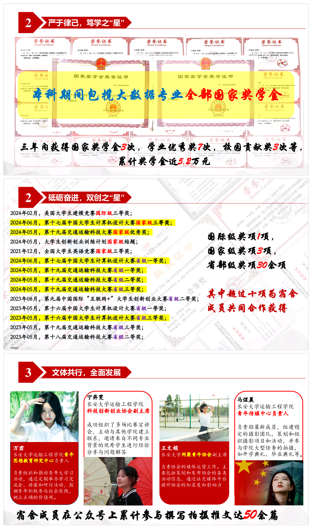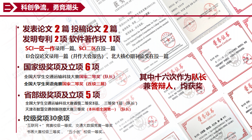 朱少轩,2021级交通工程(国际工程班)专业,担任四年班长,专业成绩排名1/72。四级665,六级593,雅思7.0。获得国家奖学金两次,发表SCI一区一作论文一篇,EI会议一篇,投稿北大核心一篇,SCI二区论文一篇。获得国家级奖项及立项六项,省级奖项及立项五项。获得长大标兵个人奖及双创之星奖。