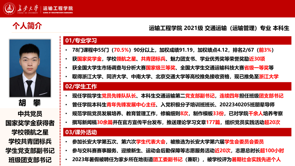 胡攀,男,中共党员,工口漫画 2021级交通运输(运输管理)专业本科生。入校以来,担任学院学生党员先锋队队长、本科生交通运输第二党支部副书记、学院本科生青年先锋发展中心主任、班级团支部书记等职务,被选为学校第六届学生会委员会委员。本科期间,获国家奖学金、长大·卓越奖·领航之星、学校共青团标兵、魅力团支书、学业优秀奖、校园贡献奖等荣誉奖励30余项,带领所在班级获学校文明班集体、五四红旗团支部、活力团支部等荣誉。现已推免至浙江大学。