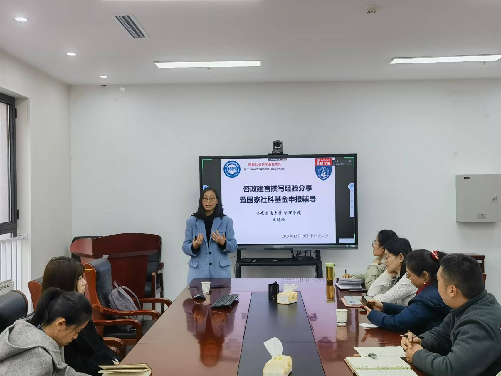 12月19日下午,工口漫画 在渭水校区召开党外人士咨政建言撰写暨国家社科基金申请专题辅导报告会。西安交通大学管理学院周晓阳教授应邀作辅导报告,院长、统战委员葛颖恩教授主持会议并讲话。