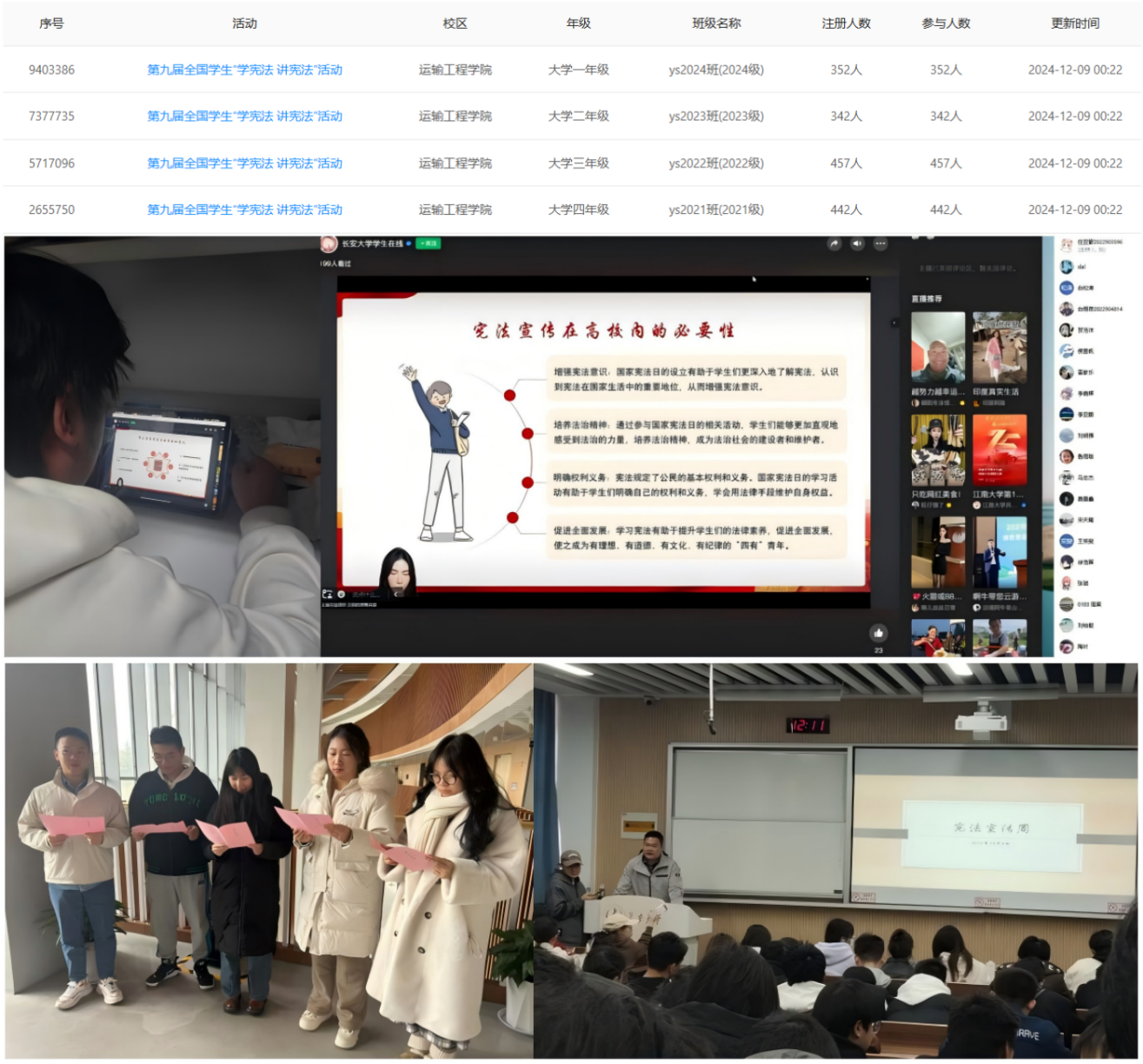 工口漫画 从宪法新风尚、宪法教育进校园、线上普法宣传三个角度在全院师生中开展了一系列形式多样、内容丰富的学习宣传教育活动。学院组织各年级学生,以班级为单位,积极参与“宪法卫士”学习活动,整体完成率100%,组织学生代表参加12·4的宪法晨读活动,并举办宪法宣传教育系列讲座,让青年学生积极投身于宪法学习,强化了青年学生法治意识。学院各年级利用班会和周见面等多种形式,向全体本科生推出了一系列宪法教育活动。学生社团积极响应,开展了宪法宣传教育周活动。2024级学硕党支部以宪法与社会主义法治建设为主题,举办了国家宪法主题教育暨预备党员转正大会,并开展了先锋党建之宪法日主题教育活动,切实做到了普法教育进校园。学院官方公众号“CHU运载青春”积极转发“长大法视通”发布的相关法律知识推送,通过新媒体平台扩大普法教育的覆盖面,为构建校园法治新风尚贡献了力量。