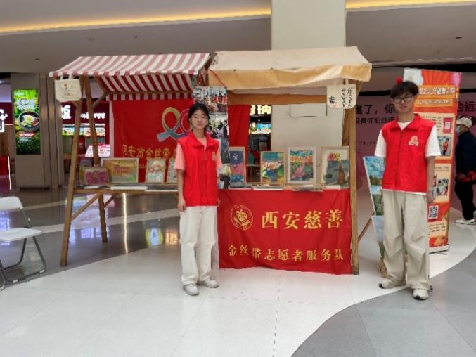而在另一侧的“爱心画展”摊位,来自金丝带患病儿童以及志愿者们的画作整齐展出。这些童真的画作色彩明亮、富有想象,吸引了很多市民驻足欣赏画作。